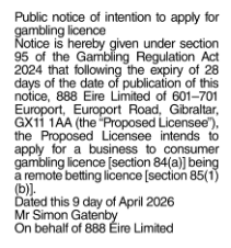 888 Eire Limited 10 Apr 26 Operator: 888 Eire LimitedDate of Publication: 09/04/2026Publication Name: The Irish Daily MailLicence Type (s): Remote Betting Related Content