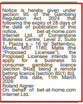 Bet-at-home.com Internet Ltd 12 Mar 26 Operator: Bet-at-home.com Internet LtdDate of Publication: 11/03/2026Publication Name: Irish IndependentLicence Type (s): Remote Betting Related Content