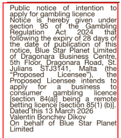Blue Star Planet Limited 18 Mar 26 Operator: Blue Star Planet LimitedDate of Publication: 13/03/2026Publication Name: Irish IndependentLicence Type (s): Remote Betting Related Content