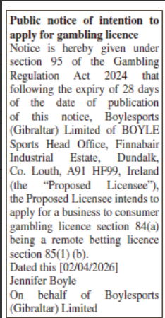 Boylesports Limited 08 Apr 26 Operator: Boylesports LimitedDate of Publication: 02/04/2026Publication Name: The Irish Daily StarLicence Type (s): Remote Betting Related Content