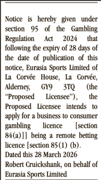 Eurasia Sports Limited 30 Mar 26 Operator: Eurasia Sports LimitedDate of Publication: 28/03/2026Publication Name: The Irish ExaminerLicence Type (s): Remote Betting Related Content