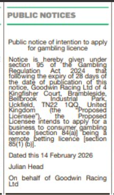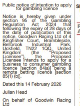 Goodwin Racing LTD 20 Feb 26 Operator: Goodwin Racing LTDDate of Publication: 14/02/2026Publication Name: The Herald. The Irish IndependentLicence Type (s): Remote Betting Related Content