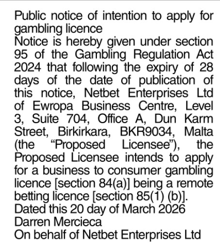 Netbet Enterprises Ltd 23 Mar 26 Operator: Netbet Enterprises LtdDate of Publication: 20/03/2026Publication Name: The Irish Daily MailLicence Type (s): Remote Betting Related Content