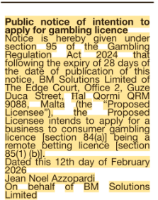 BM Solution Limited 20 Feb 26 Operator: BM Solution LimitedDate of Publication: 12/02/2026Publication Name: The HeraldLicence Type (s): Remote Betting Related Content