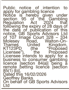 GB Sports Advisors LTD 20 Feb 26 Operator: GB Sports Advisors LTDDate of Publication: 14/02/2026Publication Name: The Irish IndependentLicence Type (s): Remote Betting Related Content
