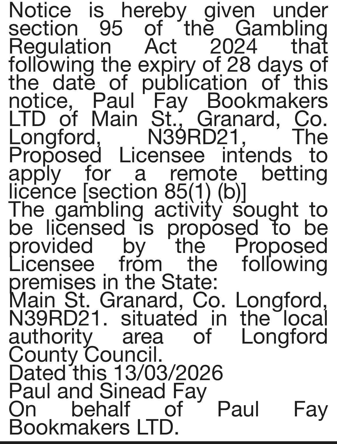 Paul Fay Bookmakers LTD 18 Mar 26 Operator: Paul Fay Bookmakers LTDDate of Publication: 13/03/2026Publication Name: Irish Independent Licence Type (s): Remote Betting Related Content