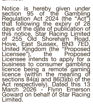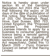 Star Racing Limited 18 Mar 26 Operator: Star Racing LimitedDate of Publication: 13/03/2026Publication Name: Irish Independent, The HeraldLicence Type (s): Remote Betting Related Content