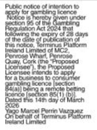 Terminus Platforms Ireland Limited 18 Mar 26 Operator: Terminus Platforms Ireland LimitedDate of Publication: 14/03/2026Publication Name: The Irish Daily MailLicence Type (s): Remote Betting Related Content