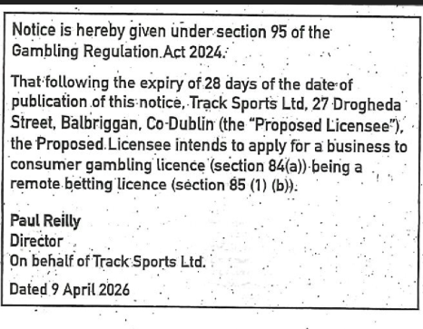 Tracksport Limited 10 Apr 26 Operator: Track Sports LimitedDate of Publication: 09/04/2026Publication Name: The Racing PostLicence Type (s): Remote Betting Related Content