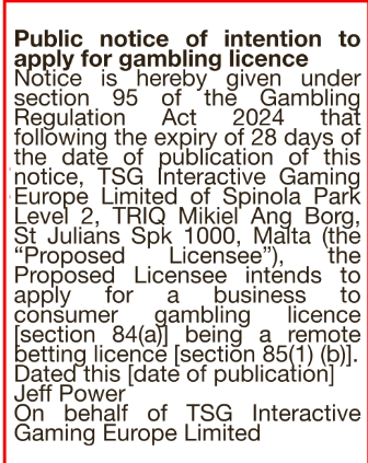 TSG Interactive Gaming Europe Limited 08 Apr 26 Operator: TSG Interactive Gaming Europe LimitedDate of Publication: 26/03/2026Publication Name: The Irish Independent Licence Type (s): Remote Betting Related Content